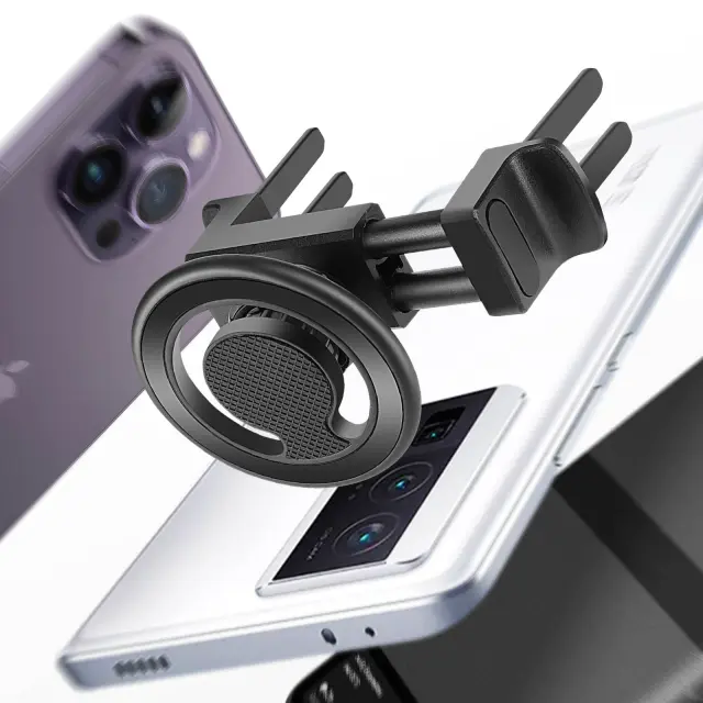 Avtomobilsko držalo znamke LinQ za pametne telefone. Avtomobilsko držalo MagSafe z 2 priloženima kovinskima plošcicama omogoca univerzalno združljivost z vašim pametnim telefonom. Nosilec okrogle prezracevalne rešetke s pokoncnim in ležecim formatom.
