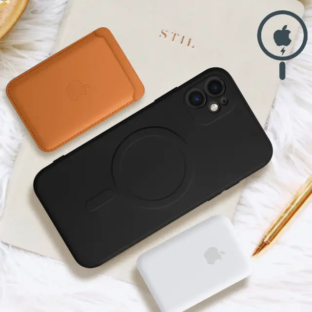 Crn Magsafe ovitek za iPhone 12 Mini, Mag Cover. Pritrdi se na dodatke Magsafe: podpora, polnilec, držalo za kartico. Izdelan iz silikona, absorbira udarce. Dvigne konturo zaslona in ovije blok kamere.