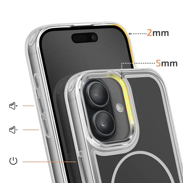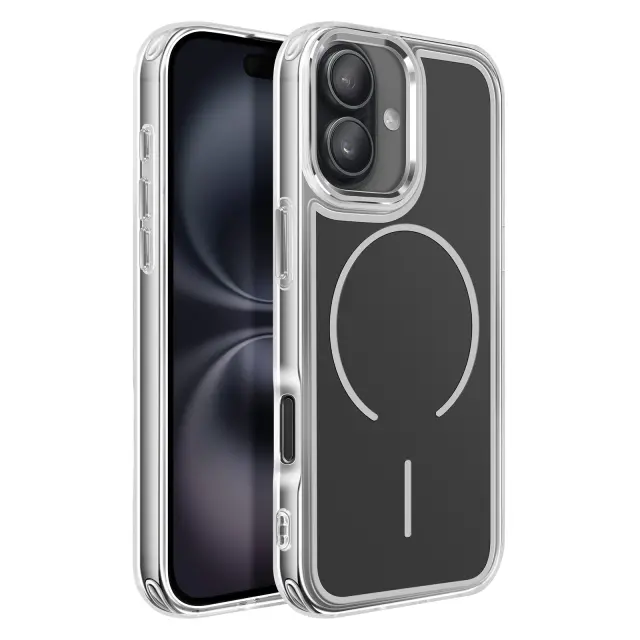 Magnetni obroč je združljiv z dodatki MagSafe in brezžičnim polnjenjem. Mat črna trda hrbtna stran za zaščito pred vsakodnevnimi odtisi. Ojačana prozorna mehka oblika, ki absorbira udarce. Kovinski robovi kamere za zaščito in slog.