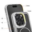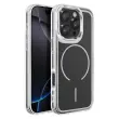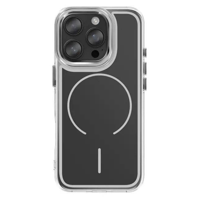 Magnetni obroč je združljiv z dodatki MagSafe in brezžičnim polnjenjem. Mat črna trda hrbtna stran za zaščito pred vsakodnevnimi odtisi. Ojačana prozorna mehka oblika, ki absorbira udarce. Kovinski robovi kamere za zaščito in slog.