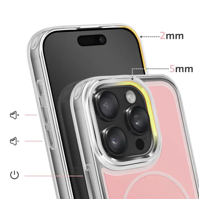 Magnetni obroč je združljiv z dodatki MagSafe in brezžičnim polnjenjem. Mat roza trda hrbtna stran za zaščito pred vsakodnevnimi odtisi. Ojačana prozorna mehka oblika, ki absorbira udarce. Kovinski robovi kamere za zaščito in slog.