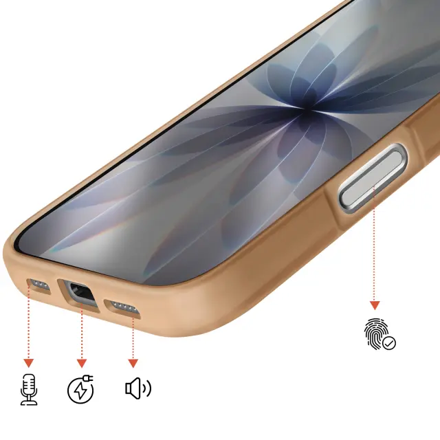Vgrajen magnetni sistem za stabilno pritrditev polnilnikov in dodatne opreme MagSafe brez odstranjevanja ohišja. Trdna polikarbonatna hrbtna stran v kombinaciji s poltrdnim silikonskim okvirjem za učinkovito zaščito pred udarci. Za 2 mm povišan sprednji rob in dodatna debelina okoli enote kamere za zmanjšanje nevarnosti prask in udarcev. Elegantna mat obdelava zmanjšuje količino prstnih odtisov, hkrati pa ohranja diskretno, sodobno obliko.