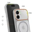 Vgrajen magnetni sistem za stabilno pritrditev polnilnikov in dodatne opreme MagSafe brez odstranjevanja ohišja. Trdna polikarbonatna hrbtna stran v kombinaciji s poltrdnim silikonskim okvirjem za učinkovito zaščito pred udarci. Za 2 mm povišan sprednji rob in dodatna debelina okoli enote kamere za zmanjšanje nevarnosti prask in udarcev. Elegantna mat obdelava zmanjšuje količino prstnih odtisov, hkrati pa ohranja diskretno, sodobno obliko.