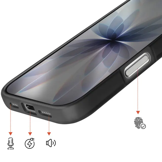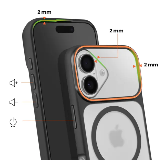 Vgrajen magnetni sistem za stabilno pritrditev polnilnikov in dodatne opreme MagSafe brez odstranjevanja ohišja. Trdna polikarbonatna hrbtna stran v kombinaciji s poltrdnim silikonskim okvirjem za učinkovito zaščito pred udarci. Za 2 mm povišan sprednji rob in dodatna debelina okoli enote kamere za zmanjšanje nevarnosti prask in udarcev. Elegantna mat obdelava zmanjšuje količino prstnih odtisov, hkrati pa ohranja diskretno, sodobno obliko.