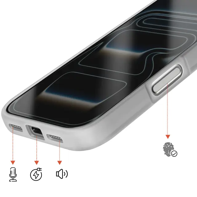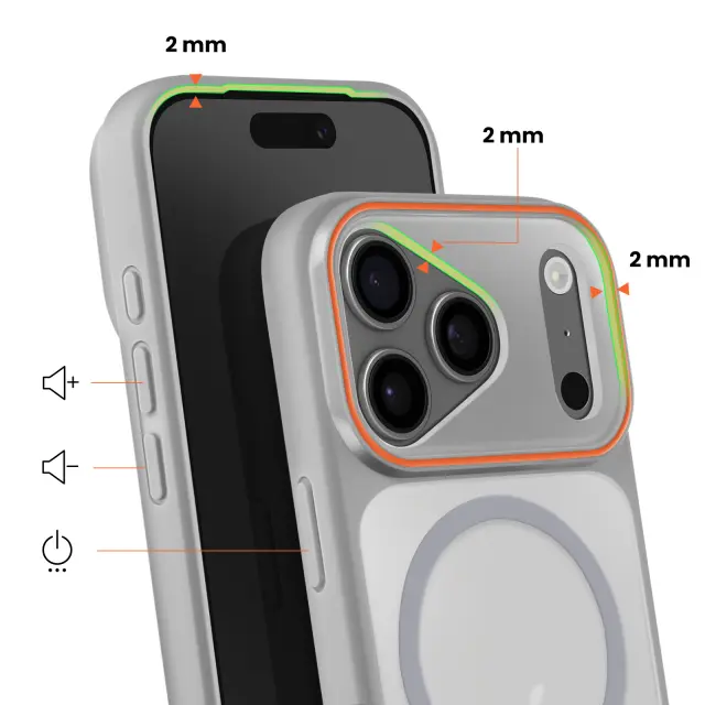 Vgrajen magnetni sistem za stabilno pritrditev polnilnikov in dodatne opreme MagSafe brez odstranjevanja ohišja. Trdna polikarbonatna hrbtna stran v kombinaciji s poltrdnim silikonskim okvirjem za učinkovito zaščito pred udarci. Za 2 mm povišan sprednji rob in dodatna debelina okoli enote kamere za zmanjšanje nevarnosti prask in udarcev. Elegantna mat obdelava zmanjšuje količino prstnih odtisov, hkrati pa ohranja diskretno, sodobno obliko.