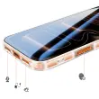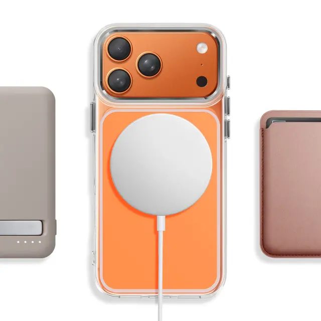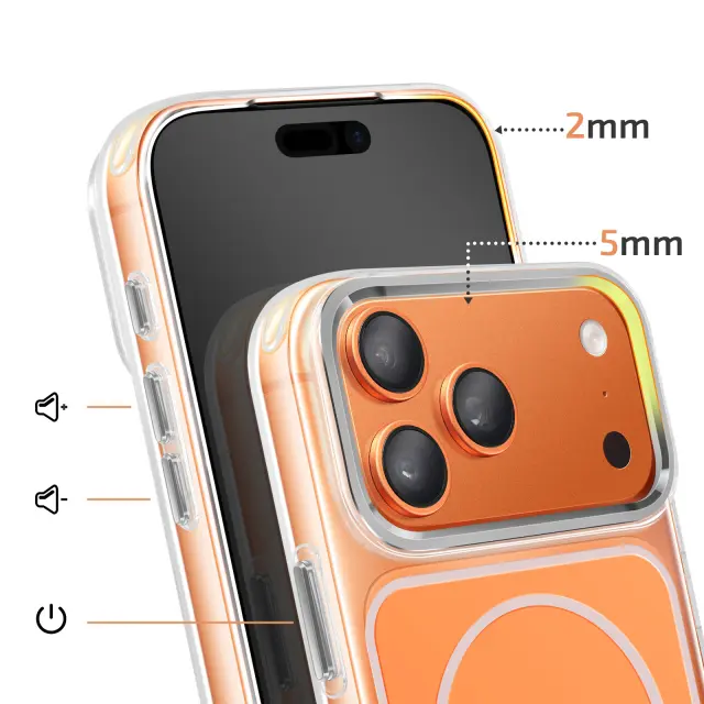 Magnetni obroč je združljiv z dodatki MagSafe in brezžičnim polnjenjem. Mat oranžna trda hrbtna stran za zaščito pred vsakodnevnimi odtisi. Ojačana prozorna mehka oblika, ki absorbira udarce. Kovinski robovi kamere za zaščito in slog.