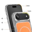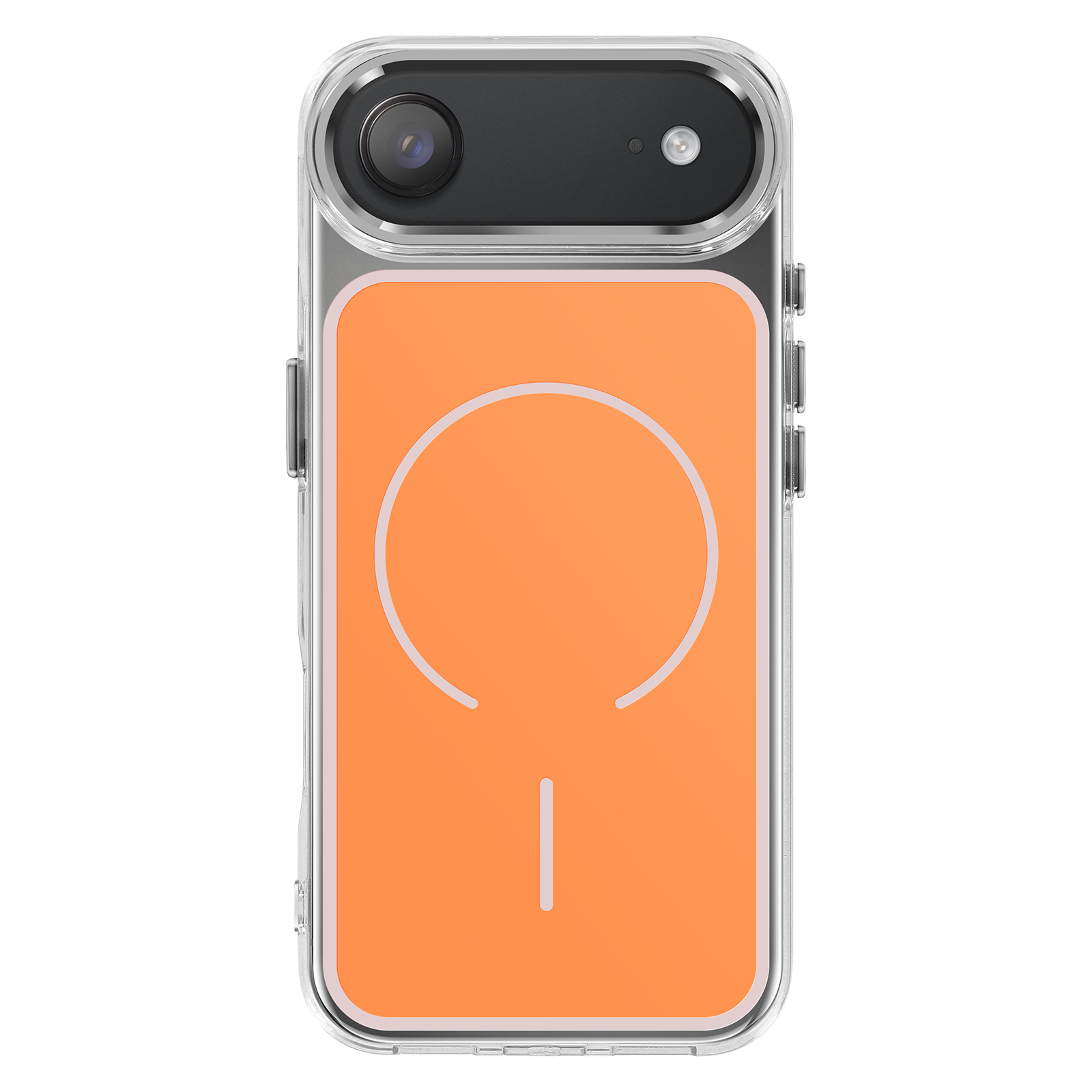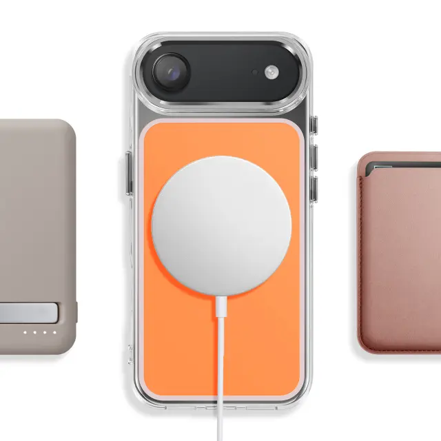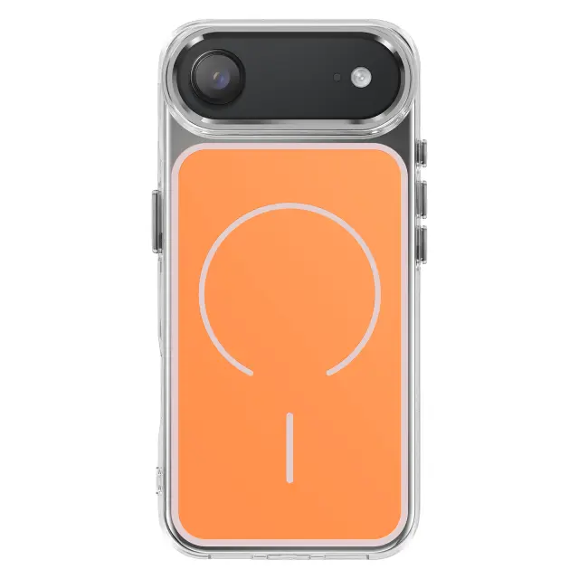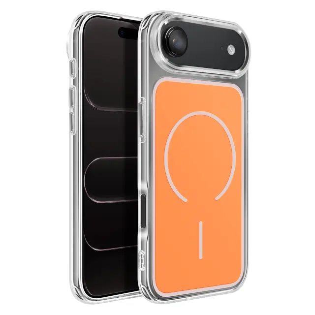 Magnetni obroč je združljiv z dodatki MagSafe in brezžičnim polnjenjem. Mat oranžna trda hrbtna stran za zaščito pred vsakodnevnimi odtisi. Ojačana prozorna mehka oblika, ki absorbira udarce. Kovinski robovi kamere za zaščito in slog.