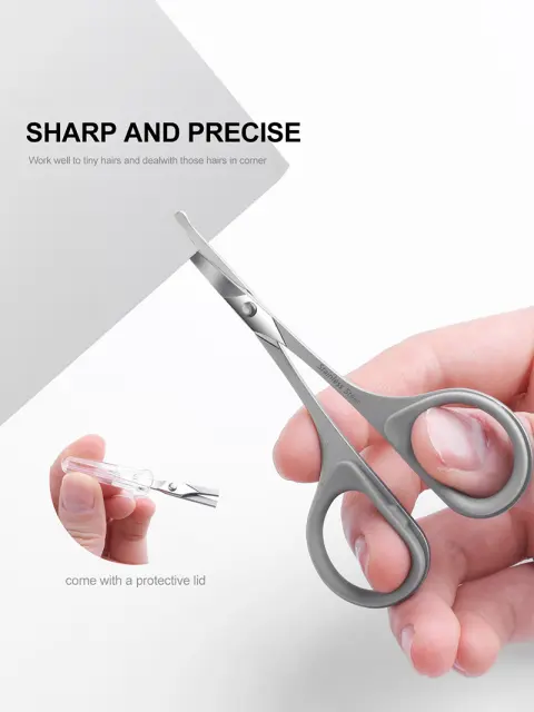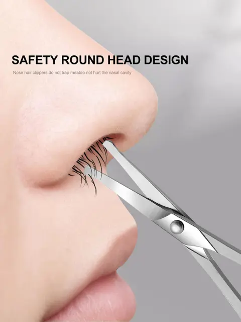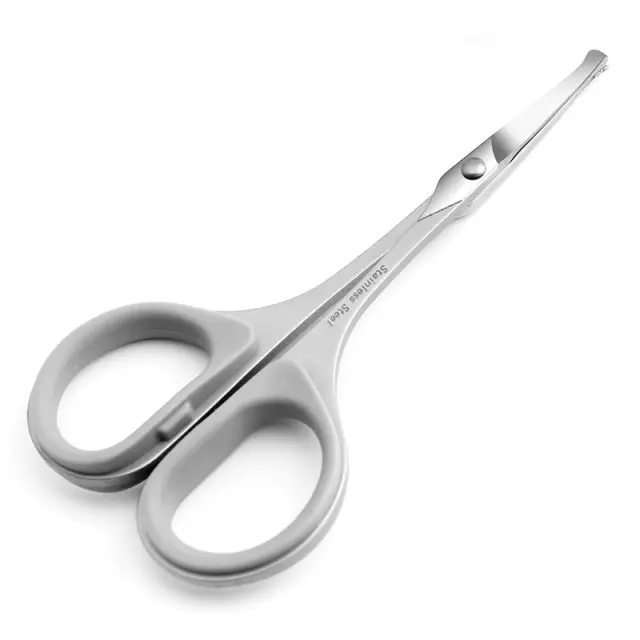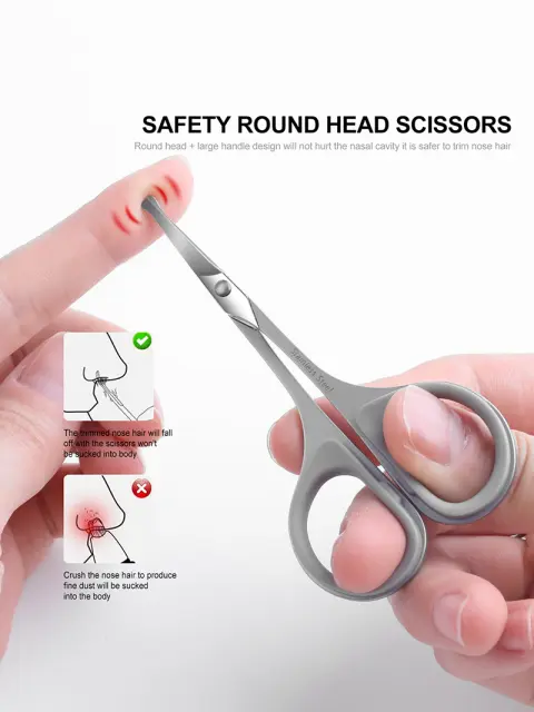 Varna zaobljena konica: Škarje imajo zaobljeno konico, ki zagotavlja varnost med uporabo in preprečuje nenamerne ureznine ali raztrganine v nosnicah.