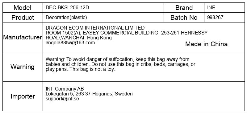Opozorilo: Da preprečite nevarnost zadušitve, hranite to torbo stran od dojenčkov in otrok. Te vrečke ne uporabljajte v zibelkah, posteljah, vozičkih ali igralih. Ta torba ni igrača.