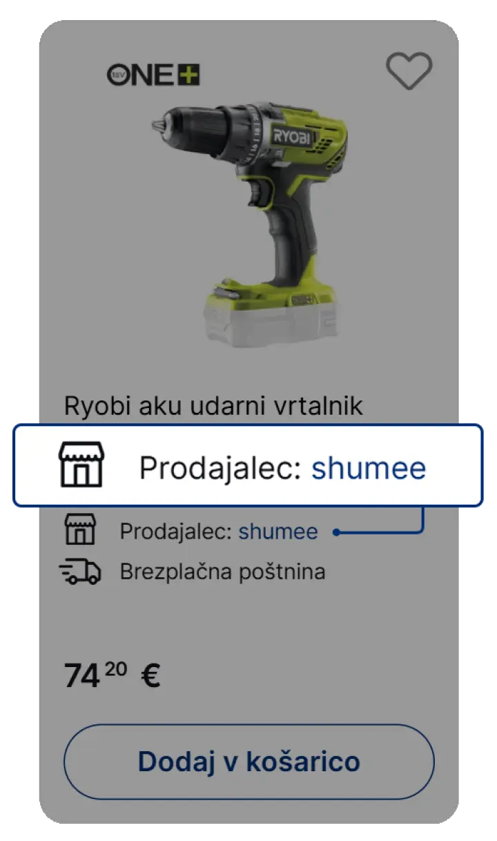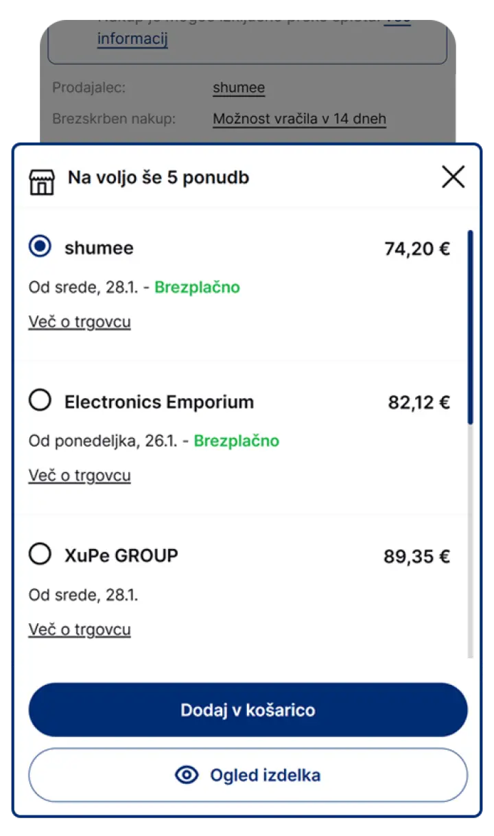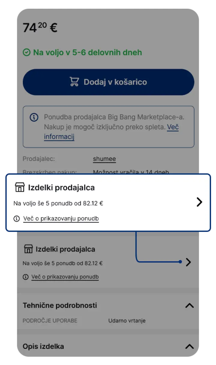 Na vsakem izdelku v Marketplace-u lahko vidiš ime prodajalca. Posamezni izdelek ima lahko več različnih prodajalcev. Na strani vsakega izdelka lahko pod gumbom Dodaj v košarico vidiš število ponudb in prodajalce. Željeno ponudbo izbereš in klikneš Dodaj v košarico.