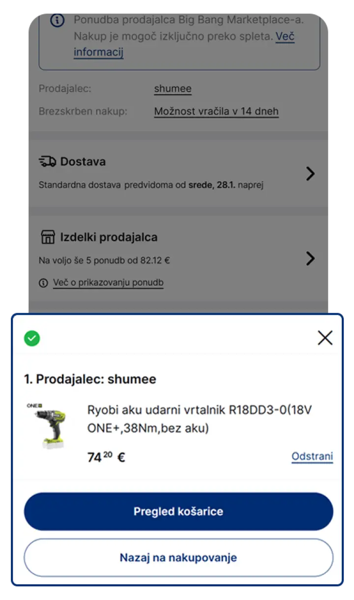 Big Bang Marketplace združuje izdelke različnih prodajalcev na enem mestu. Pri vsakem izdelku vidiš, kdo izdelek ponuja, lahko je to Big Bang ali katerikoli drug prodajalec, in po kakšni ceni. Prodajalec, ki prejme naročilo, odpošlje paket.