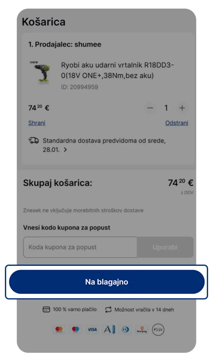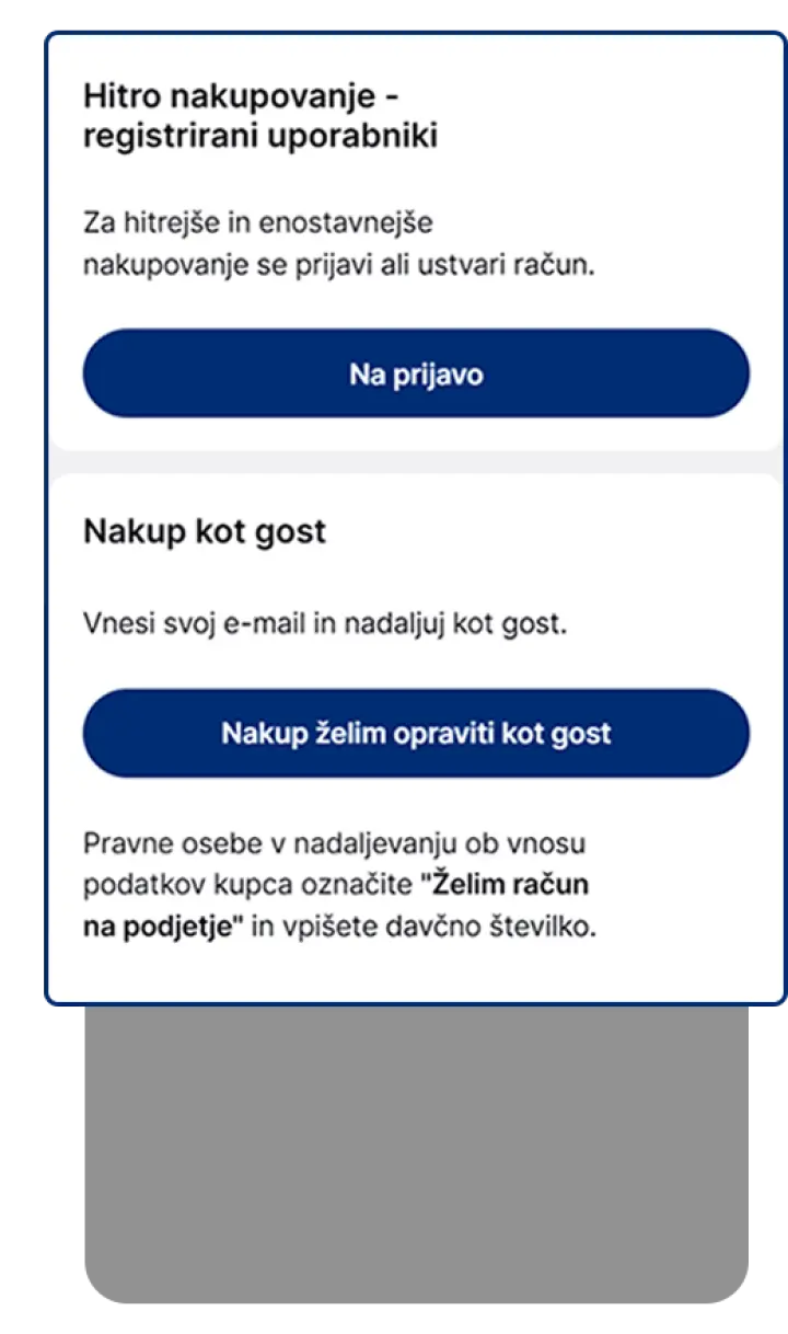 Nakup je povsem preprost: Izbereš izdelek, ki ga želiš naročiti in klikneš gumb 'Dodaj v košarico'. V košarici si lahko izdelke še enkrat ogledaš in nato klikneš gumb 'Na blagajno'. Nakup lahko opraviš kot gost ali kot registrirani uporabnik