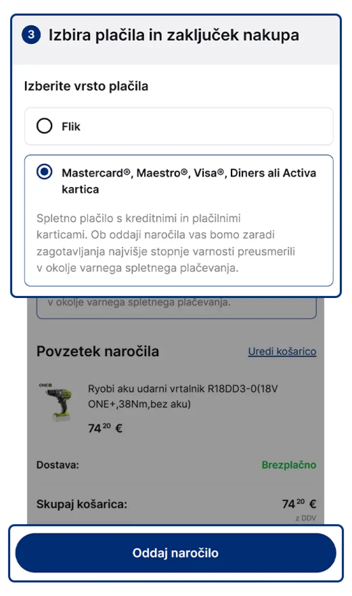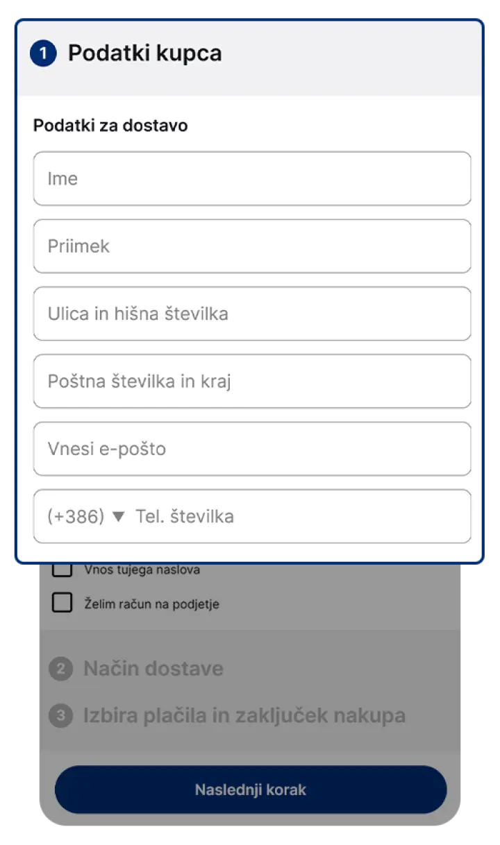 V prvem koraku oddaje naročila vpišeš svoje podatke za dostavo. V naslednjem koraku se prikažejo informacije o predvidenem trajanju dostave in ceni poštnine. Plačilo je možno izključno s kartico. Ko izpolniš vse potrebne podatke, klikni gumb 'Oddaj naročilo'. Po zaključku plačila prejmeš potrdilo o naročilu preko e-pošte.