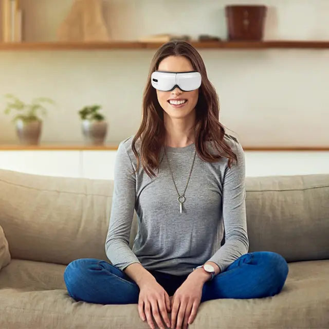 Masažni pripomoček v obliki očesne maske deluje proti utrujenim očem, temnim kolobarjem in gubam pod očmi. Naprava masira z vibracijami in temperaturo 42°C ter ima tri različne stopnje. Masažer za oči pomaga razbremeniti napete mišice okoli oči. Toplota povzroči povečan krvni obtok okoli oči. Maska za oči ima vgrajeno tudi glasbeno funkcijo, da se lahko med masažo popolnoma sprostite. Masažno masko upravljate s pomočjo zaslona, ki je preprost za krmarjenje.