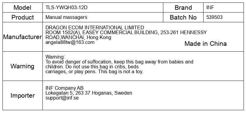 Opozorilo: Da bi se izognili nevarnosti zadušitve, vrečko hranite izven dosega dojenčkov in otrok. Vrečke ne uporabljajte v otroških posteljicah, vozičkih ali igralih. Ta vreča ni igrača.