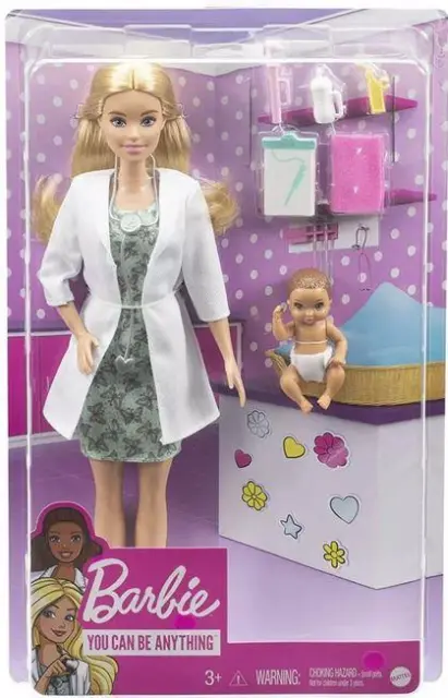 Z Barbie pediatričnim setom je skrb za majhne paciente res zabavna! Barbie pediatrinja (približno 30 cm) je pripravljena skrbeti za svoje majhne paciente v prikupni obleki z vzorcem metuljev in belem zdravniškem plašču. Njeni mali pacienti so v plenicah in zaviti v rožnato odejico.