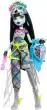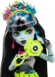 Lutka Frankie Stein iz Monster High je osvojila vstopnico za Monster Fest, najkul glasbeni festival! Z bleščečo obleko in električnimi dodatki komaj čaka jesti, plesati in biti strašljiva! Ta pošastna lutka je pripravljena za nastop na odru v mrežasti majici in srebrnih hlačah z asimetričnimi resicami. Venček iz bliskov dodaja še več električnega sloga! Ne glede na to, ali poje v občinstvu ali nastopa s svojo ekipo, njen koncertni outfit izstopa z luksuznimi detajli, kot so uhani v obliki kablov, neonska torba in čevlji v obliki disko krogle. Eden najboljših delov festivala je hrana! Frankie Stein komaj čaka, da napolni baterije z električnim hot dogom in pokajočim napitkom. Instantna kamera je kot nalašč za fotografiranje s pošastmi! Tematski dodatki, kot so zapestnica, plakat pop zvezde in še več, omogočajo pripovedovanje festivalskih zgodb.