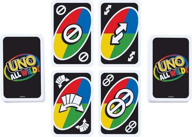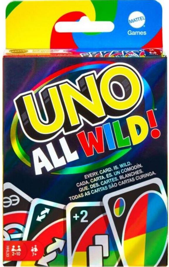 Vsaka karta je Divja Karta v igri UNO All Wild! Igra je hitra, saj ni potrebno ujemanje barv ali številk kot v klasičnem UNO. Zaradi akcijskih kart v kupu je še bolj presenetljiva – Divji Obrat, Divji Preskok in Preskok 2, Divji Vzemi 2 in 4, Divja Prisilna Menjava in Divja Ciljana Vzemi 2. Ne pozabi – ko imajo igralci le eno karto, morajo zaklicati "UNO!" Odlično darilo za oboževalce igre UNO, stare 7 let in več.