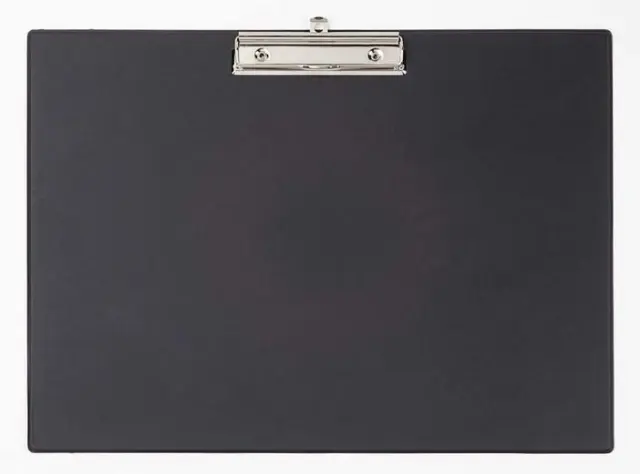 - podloga za pisanje - izdelana iz kartona s PVC prevleko - ploska kromirana vpenjalna sponka z obešanko - odpiranje sponke ca. 0,8 cm - debelina kartona 0,4 cm