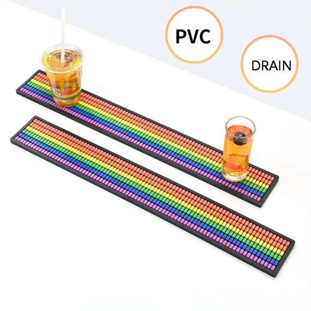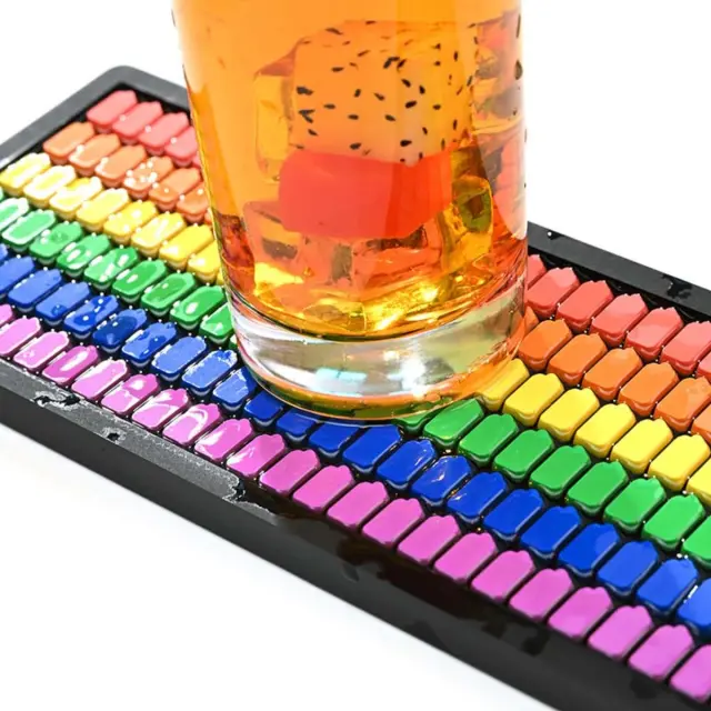 Izjemen protizdrsni oprijem: PVC konstrukcija te mavrične barske kapalne podloge zagotavlja izjemne protizdrsne lastnosti. To je še posebej uporabno v prometnih barskih okoljih, kjer so razlitja pogosta in površine lahko postanejo spolzke. Teksturirana površina zagotavlja varen oprijem za stekleno posodo, preprečuje nenamerne zdrsne in lomove, kar na koncu zmanjšuje odpadke in zagotavlja varnejše delovno okolje za natakarje in osebje. Njegova protizdrsna površina nudi stabilnost visokim koktajl kozarcem, kar zmanjšuje tveganje razlitja in nesreč. Podloga je idealna za profesionalne natakarje, ki iščejo rešitev za vzdrževanje čiste in organizirane delovne površine.