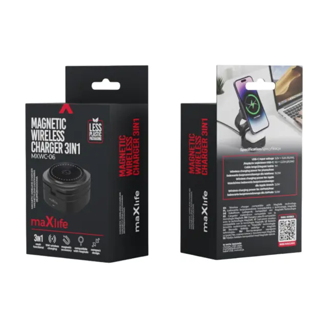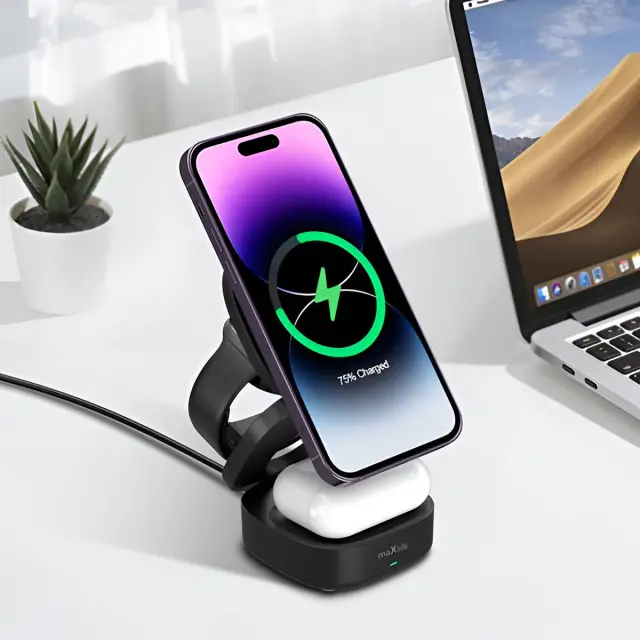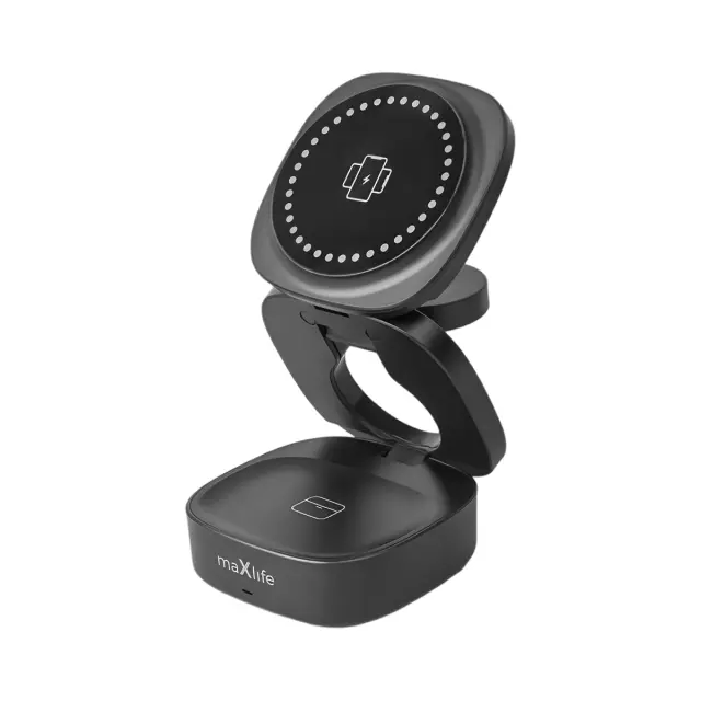 Ta črna brezžična polnilna postaja 3 v 1 hkrati polni pametni telefon, slušalke AirPods Qi in uro Apple Watch. Magnetni modul stabilizira in poravna pametni telefon za hitro polnjenje do 15 W. Območje slušalk TWS podpira brezžično polnjenje Qi. Stranska opora omogoča polnjenje ure Apple Watch v ustreznem položaju.