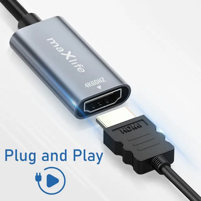 Adapter Maxlife sidereal grey USB-C na HDMI za povezovanje naprave z zunanjimi zasloni in razširitev delovnega prostora. Uživajte v izjemni kakovosti slike z ločljivostjo 4K pri 60 Hz, ki je idealna za filme, profesionalne predstavitve in igre. Čip E-mark, vgrajen v adapter, zagotavlja zanesljivo povezavo in nemoten, neprekinjen prenos signala.. Popolnoma združljiv s številnimi napravami USB-C, vključno s prenosniki, tabličnimi računalniki in pametnimi telefoni.