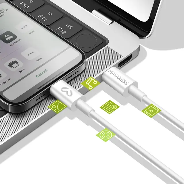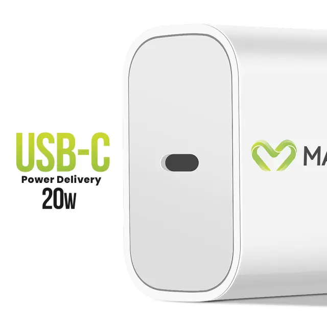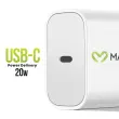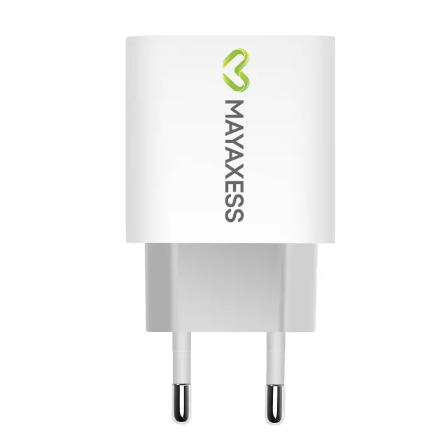 Omrežni polnilnik s kablom USB-C Mayaxess za hitro polnjenje združljivih naprav. Hitro polnjenje je zagotovljeno zaradi 20 W moči in priloženega kabla USB-C. Učinkovito napajanje pametnih telefonov in tabličnih računalnikov s tehnologijo Power Delivery. Povečana varnost pred prenapetostjo in povišanjem temperature.