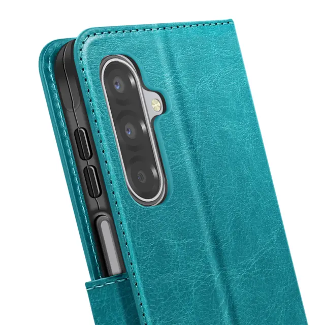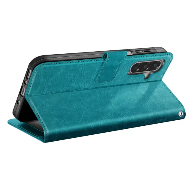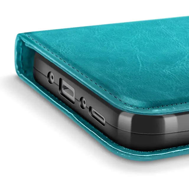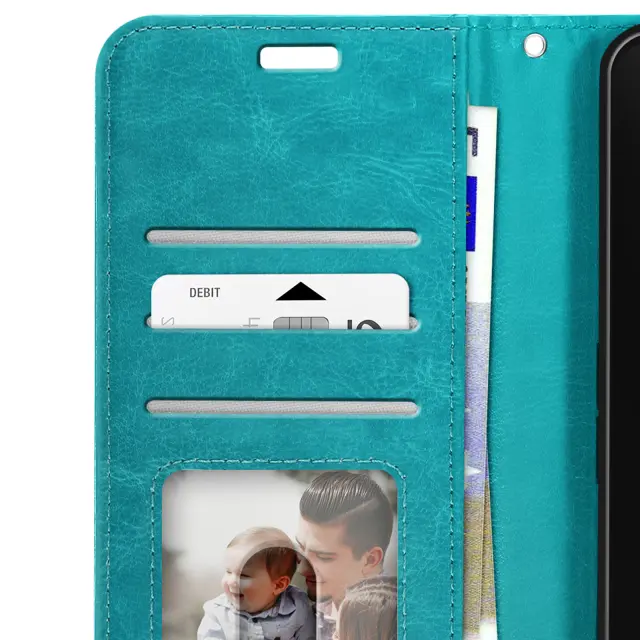 Ta denarnica za Galaxy A17 v račje modri barvi združuje satenast zaključek in praktično zasnovo za vsakodnevno uporabo.. Notranji zavihek ima tri vodoravne reže za bančne kartice, priponke ali vstopnice.. Prozoren spodnji žep za prikaz fotografije ali osebne izkaznice. Mehka notranja lupina TPU drži pametni telefon na mestu in ščiti robove pred udarci.