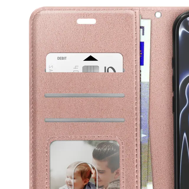 Ta rožnato-zlati kovček za iPhone 17 Pro Max združuje zrnat in satenast zaključek s praktično zasnovo za vsakodnevno uporabo.. Notranji zavihek ima tri reže za bančne kartice, priponke ali vstopnice.. Prozoren spodnji žep za prikaz fotografije ali osebne izkaznice. Mehka notranja lupina TPU drži pametni telefon na mestu in ščiti robove pred udarci.