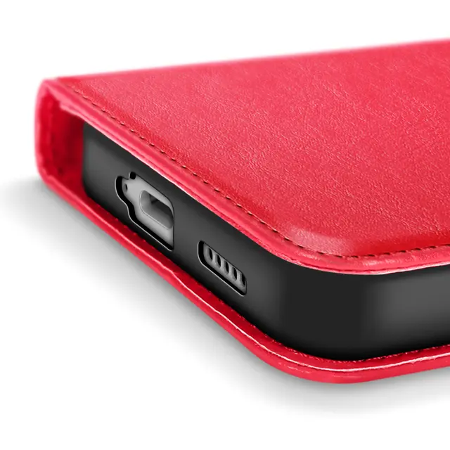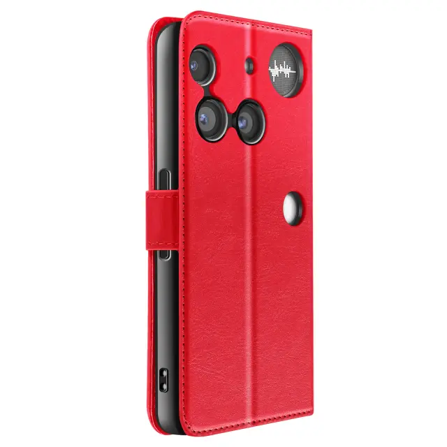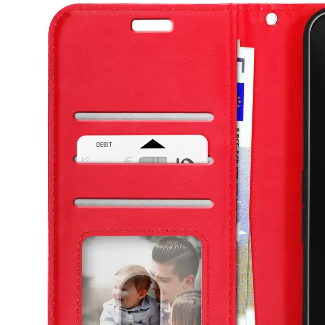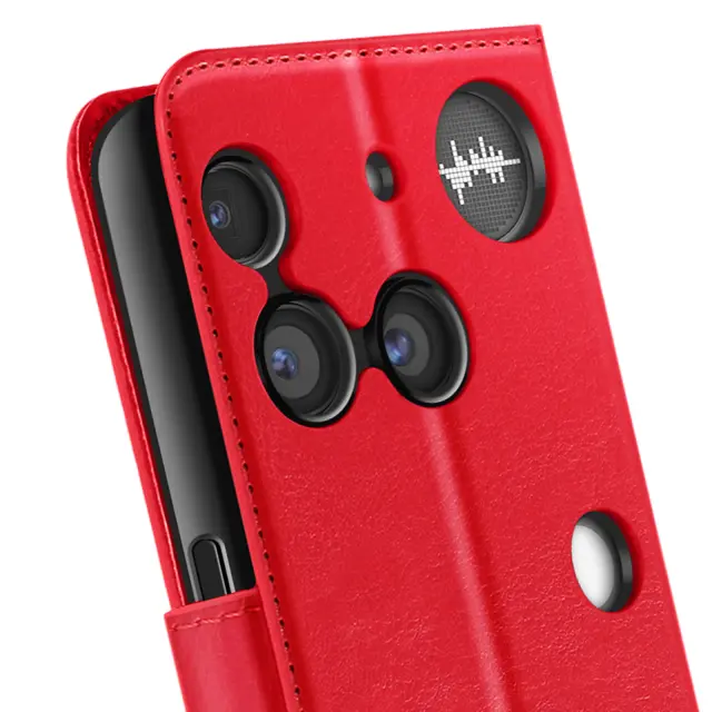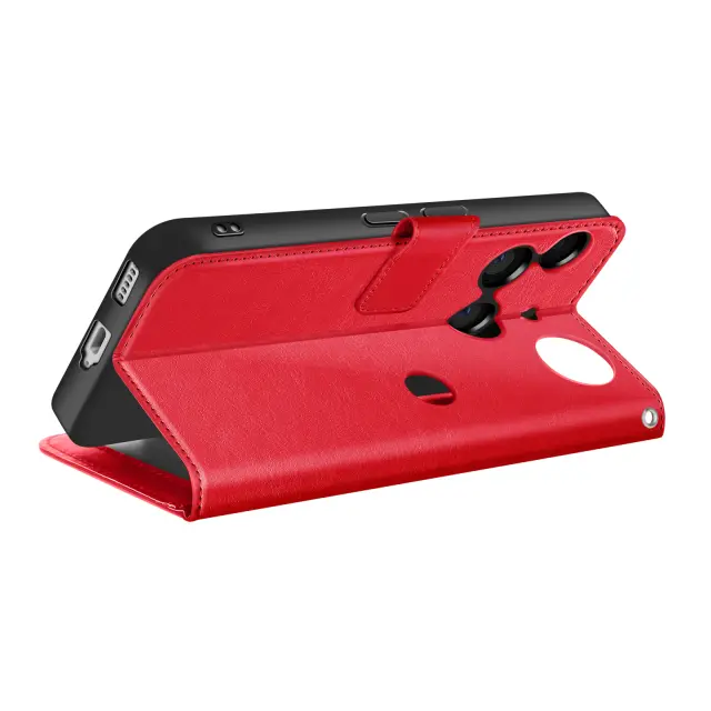 Eleganten etui z usnjenim vzorcem in več predali za kartice in bankovce. Vključen je trak za roke za varno in praktično prenašanje na poti. Funkcija video podpore za udobno gledanje brez uporabe rok. Vgrajeni predali za kartice, zapiske ali fotografije.
