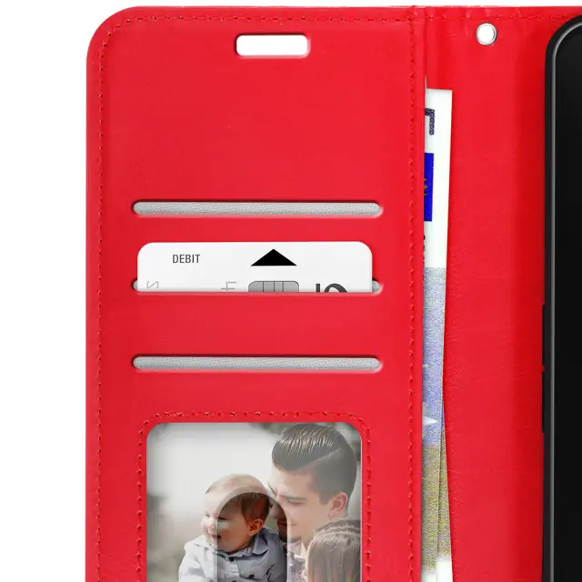 Eleganten etui z usnjenim vzorcem in več predali za kartice in bankovce. Vključen je trak za roke za varno in praktično prenašanje na poti. Funkcija video podpore za udobno gledanje brez uporabe rok. Vgrajeni predali za kartice, zapiske ali fotografije.