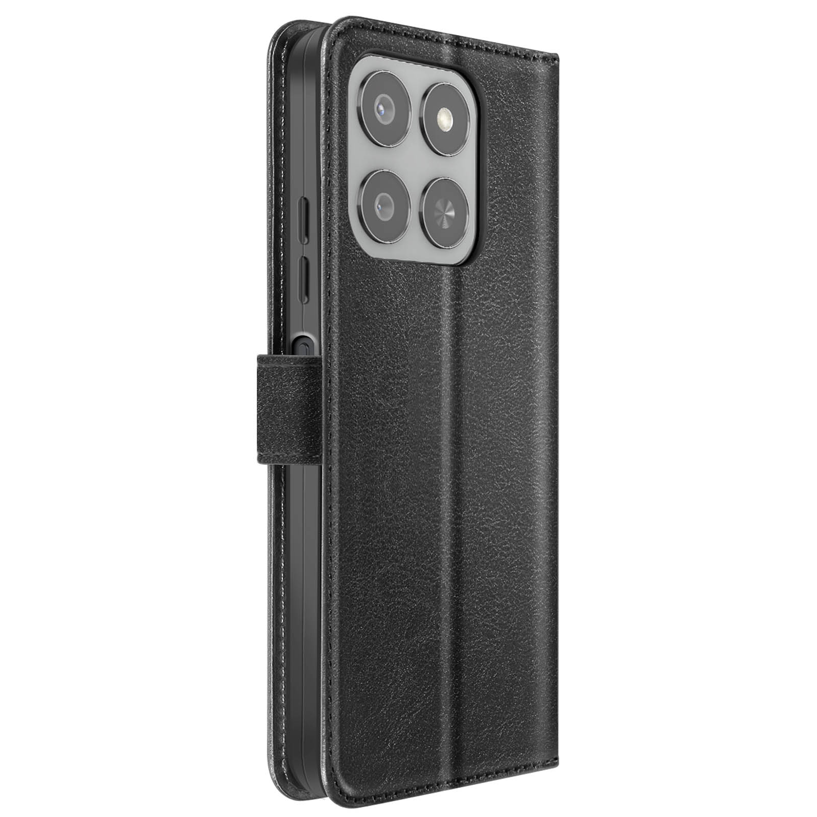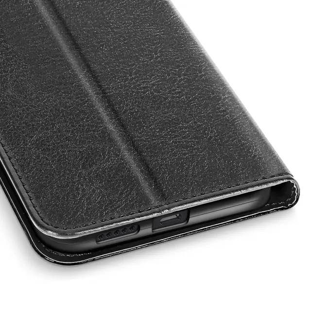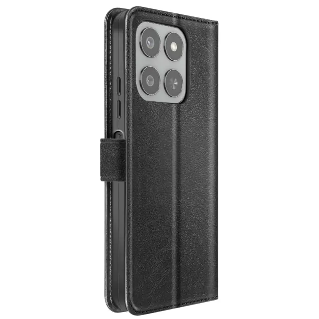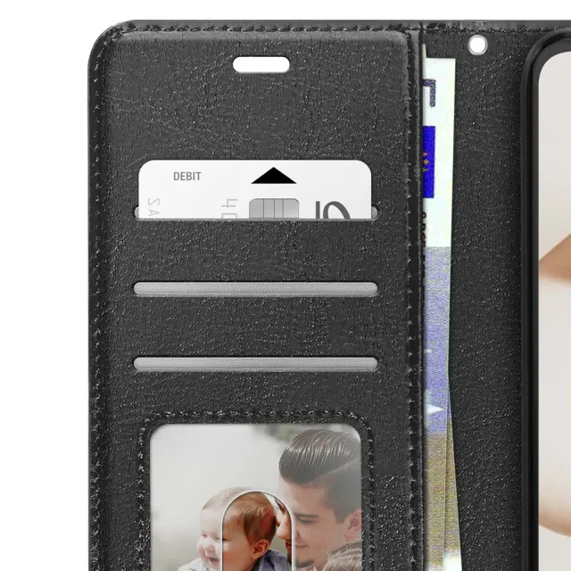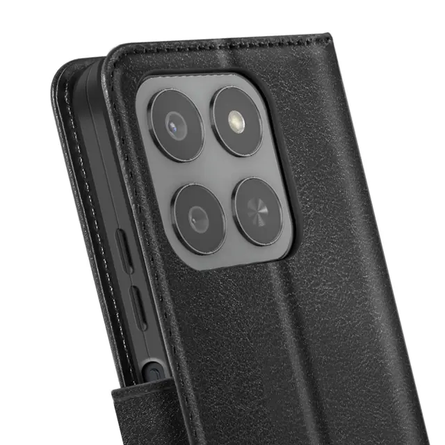 Elegantna črna prevleka z učinkom usnja, ki je prijetna v roki. Vključen je trak za roke za varen in enostaven transport. Vgrajena funkcija za podporo videa za prostoročno uporabo. Diskretni notranji predali za kartice in zapiske.