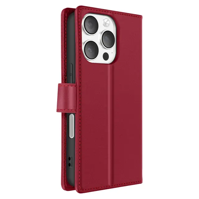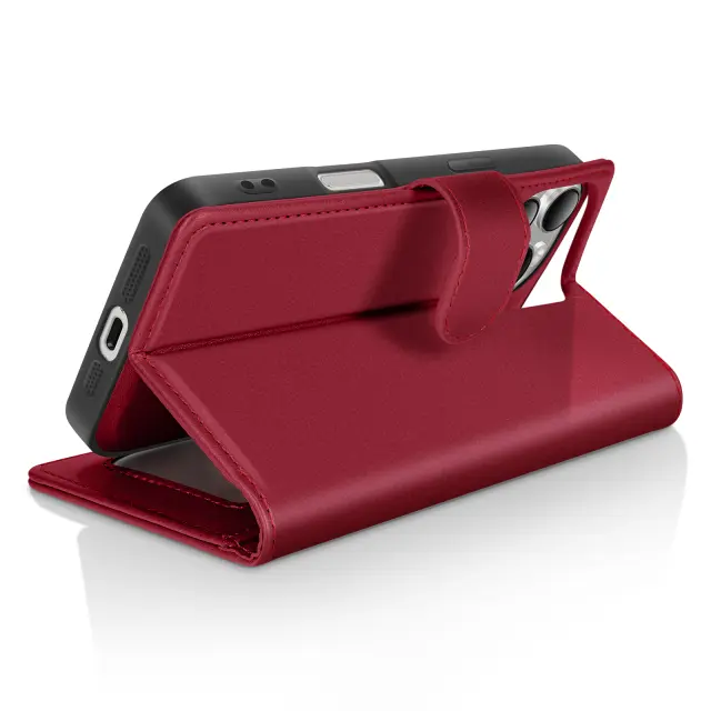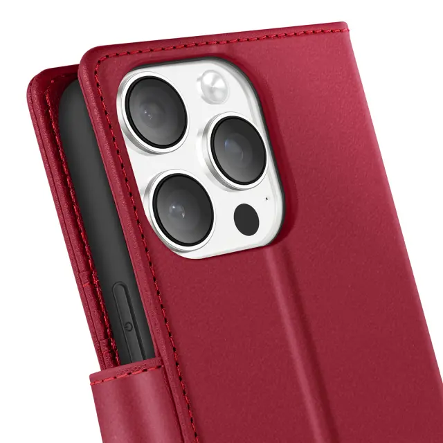 Rdeč ovitek Mayaxess za iPhone 16 Pro, ki ga lahko stilsko oblečete. Z enim samim gibom enostavno preklopite iz denarnice v preprosto lupino. Izkoristite zanesljivo magnetno zapiranje, ki lupino varno drži na mestu. Zaščitite zaslon in objektiv z ojačanimi zaščitnimi robovi.