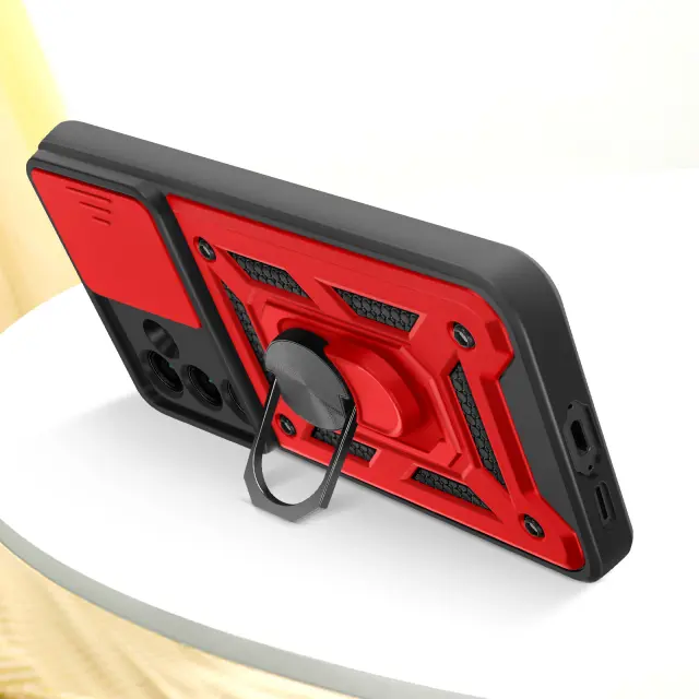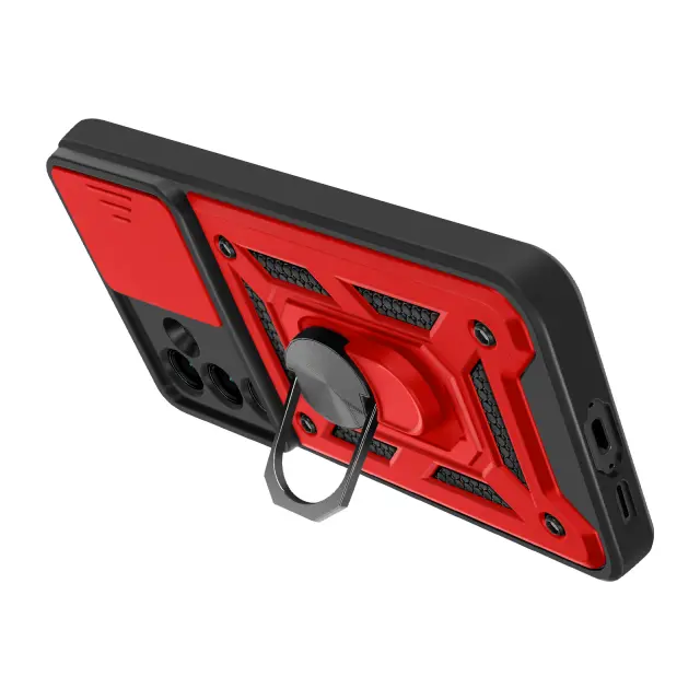 Rdeče ohišje iz dvomaterialnega materiala Mayaxess, vrhunska zaščita za vaš Samsung Galaxy S24 FE. Izdelan je iz togega polikarbonata in prožnega silikonskega gela ter zagotavlja optimalno zaščito pred praskami in udarci.. Testirano po standardu MIL-STD-810G 516.6, kar zagotavlja varno zaščito pred padci. Drsni pokrov kamere za zaščito enote kamere pred praskami in udarci za večjo vzdržljivost.