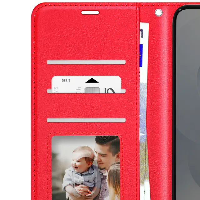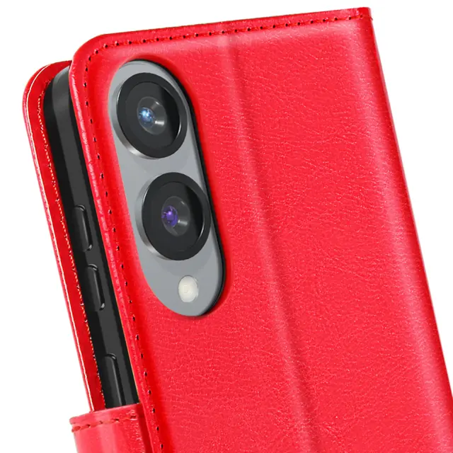 Rdeč zaščitni ovitek, posebej zasnovan za zaščito telefona Samsung Galaxy S25 Edge. Vgrajen prostor za shranjevanje kartic in zapiskov v podlogi zavihka. Zložljiv zavihek za vodoravno podporo telefona, da lahko uživate v vsebini. Odporna prevleka, ki pametni telefon učinkovito ščiti pred udarci in praskami.