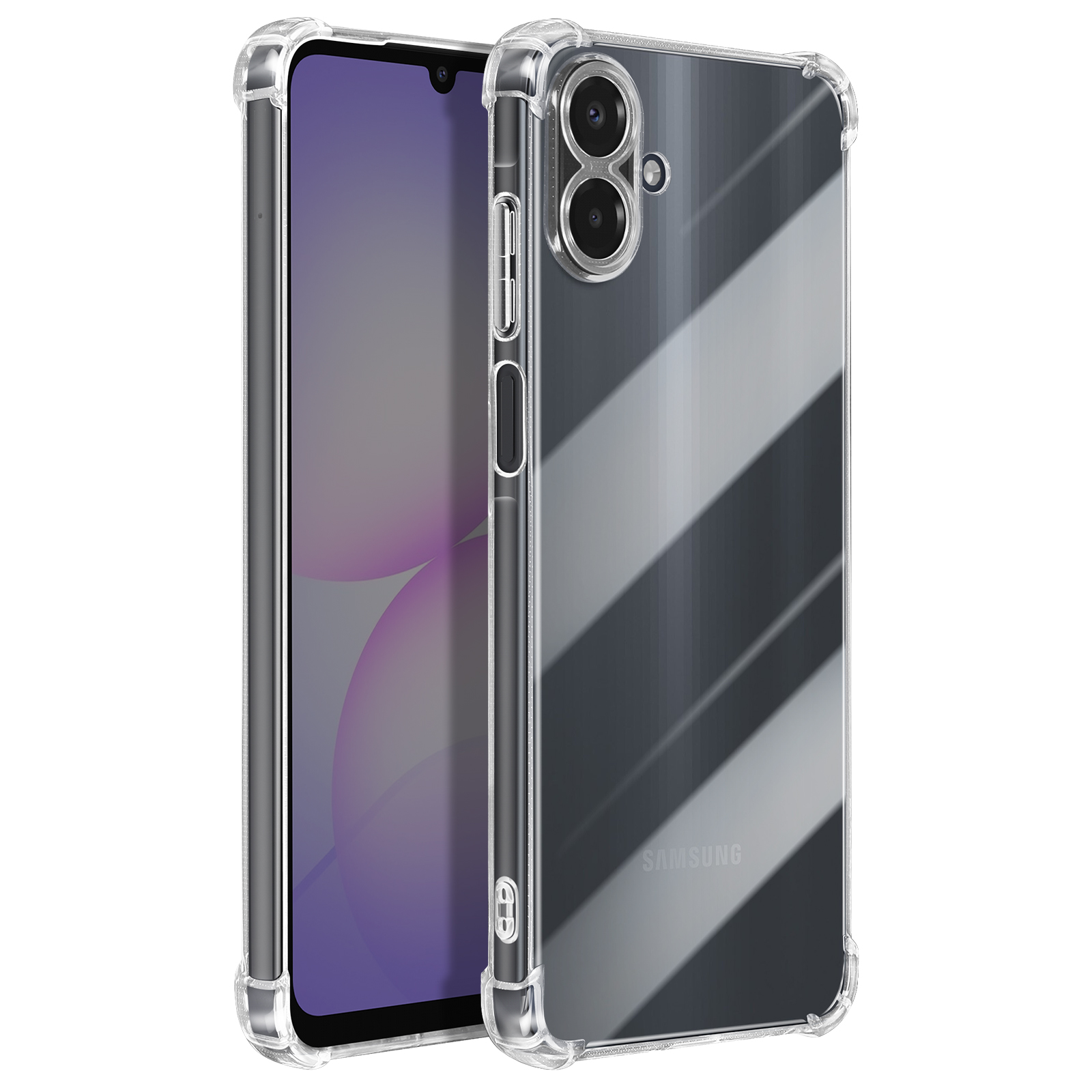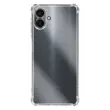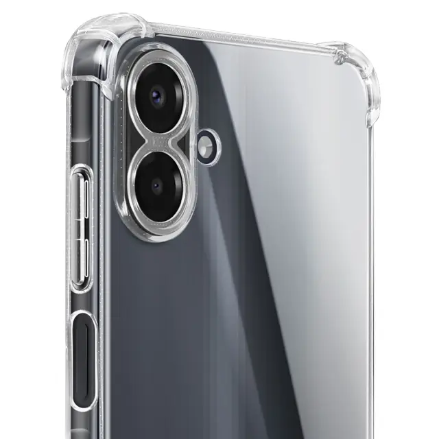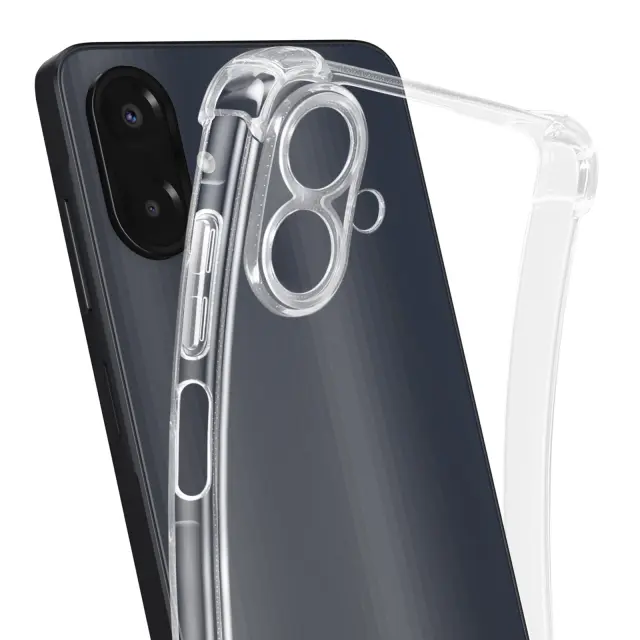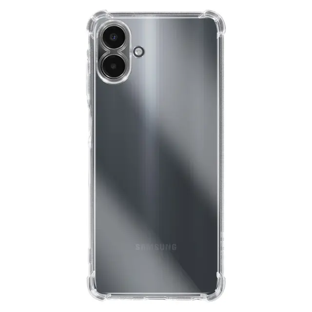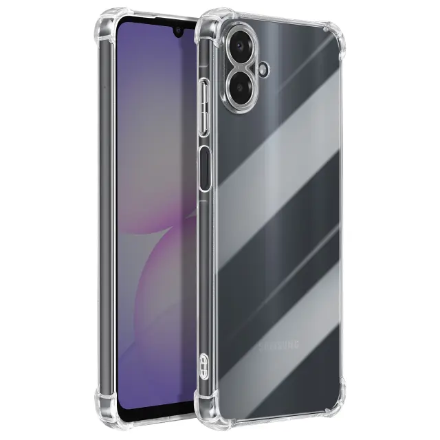 To prozorno ohišje iz mehkega silikona ščiti telefon Galaxy A07, ne da bi prekrilo njegov prvotni videz.. Mehak silikon obdaja telefon in ga varuje, ne da bi mu dodajal nepotrebno debelino. Ojačani vogali absorbirajo udarce in zmanjšujejo tveganje razpok ob padcu.. Notranja obloga proti praskam omejuje vlago med ohišjem in hrbtno stranjo pametnega telefona.