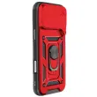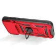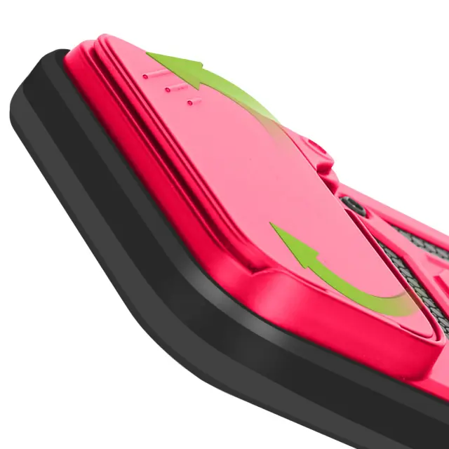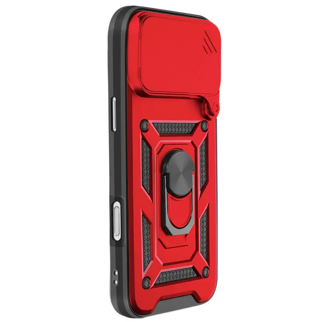 To rdeče ohišje za iPhone 17 Pro Max ima trdno teksturirano polikarbonatno zadnjo stran z mat površino, ki je odporna na praske in sledi.. Okvir lupine je skladen s standardi MIL-STD-810G 516.6 in učinkovito absorbira udarce večkratnih padcev. Kovinski vrtljivi obroč se vrti za 360° in drži napravo v vodoravnem položaju za videoposnetke ali videoklice.. Zaradi feromagnetnega vložka, vgrajenega v obroč, je lupina združljiva z magnetnimi nosilci za avtomobile..