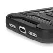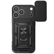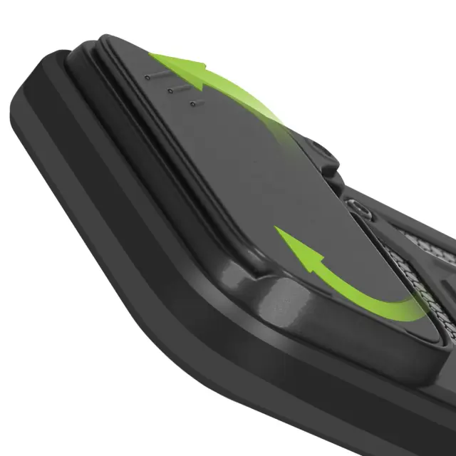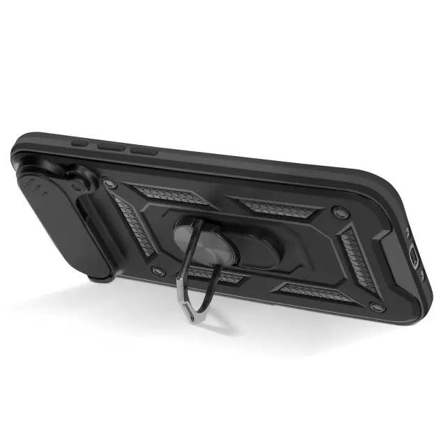 To črno ohišje za iPhone 17 Pro Max ima trdno teksturirano polikarbonatno zadnjo stran z mat površino, ki je odporna na praske in sledi.. Okvir lupine je skladen s standardi MIL-STD-810G 516.6 in učinkovito absorbira udarce večkratnih padcev. Kovinski vrtljivi obroč se vrti za 360° in drži napravo v vodoravnem položaju za videoposnetke ali videoklice.. Zaradi feromagnetnega vložka, vgrajenega v obroč, je lupina združljiva z magnetnimi nosilci za avtomobile..