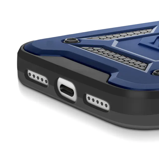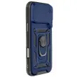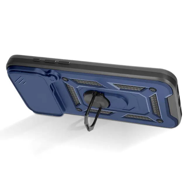 To polnočno modro ohišje za iPhone 17 Pro Max ima trdno hrbtno stran iz polikarbonata s teksturo in mat površino, ki je odporna na praske in sledi.. Okvir lupine je skladen s standardi MIL-STD-810G 516.6 in učinkovito absorbira udarce večkratnih padcev. Kovinski vrtljivi obroč se vrti za 360° in drži napravo v vodoravnem položaju za videoposnetke ali videoklice.. Zaradi feromagnetnega vložka, vgrajenega v obroč, je lupina združljiva z magnetnimi nosilci za avtomobile..