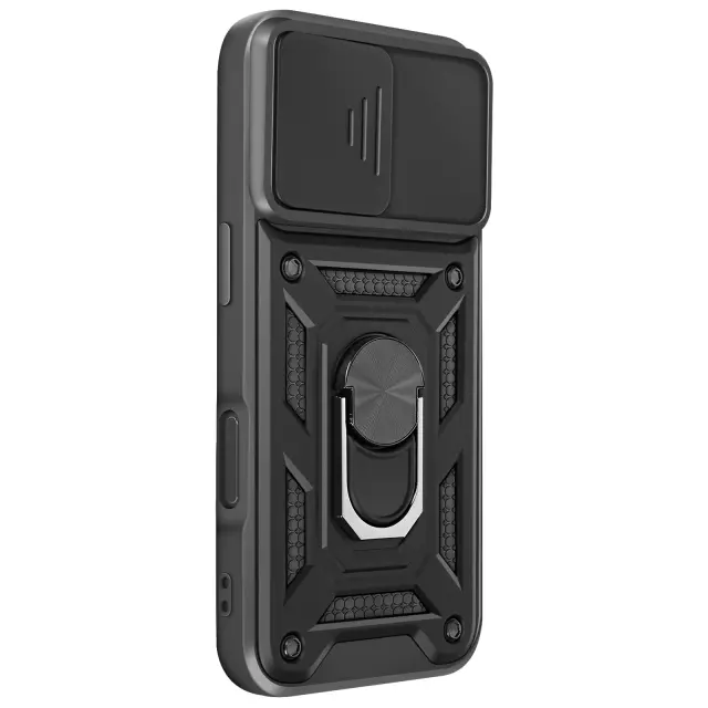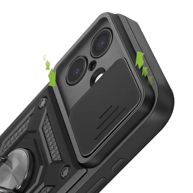 Hibridna zasnova za optimalno absorpcijo vsakodnevnih udarcev. Vojaški certifikat MIL-STD-810G za večjo odpornost proti padcem in udarcem. Vgrajen drsni pokrov kamere za diskretno in učinkovito zaščito objektiva. Večnamenski vrtljivi obroč za boljši oprijem in stabilno podporo gledanju.
