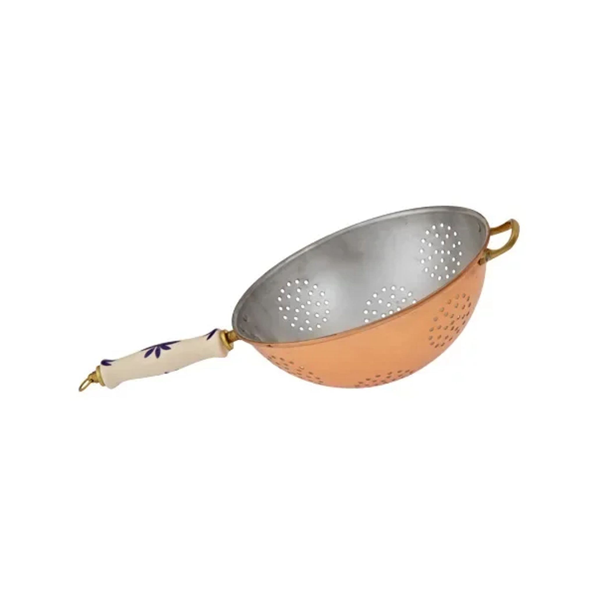 To medenin sitko z notranjo površino prevlečeno s kositrom in porcelanskim ročajem je praktičen in estetski dodatek vsaki kuhinji. Masivna medenina zagotavlja robustnost, verzinska prevleka pa ščiti pred oksidacijo in olajša čiščenje.