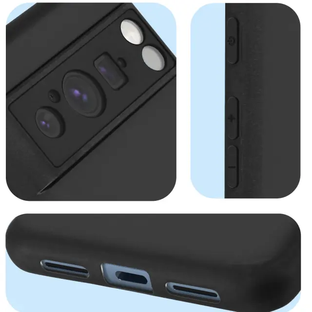 Zašcita Google Pixel 8 Pro iz mehkega silikona. Ovitek za Pixel 8 Pro iz crnega silikona, odporen na udarce in praske. Dvignjen zaslon in rob kamere za vecjo zašcito pred padci. Ultra tanek, umirjen in eleganten ovitek Google Pixel.