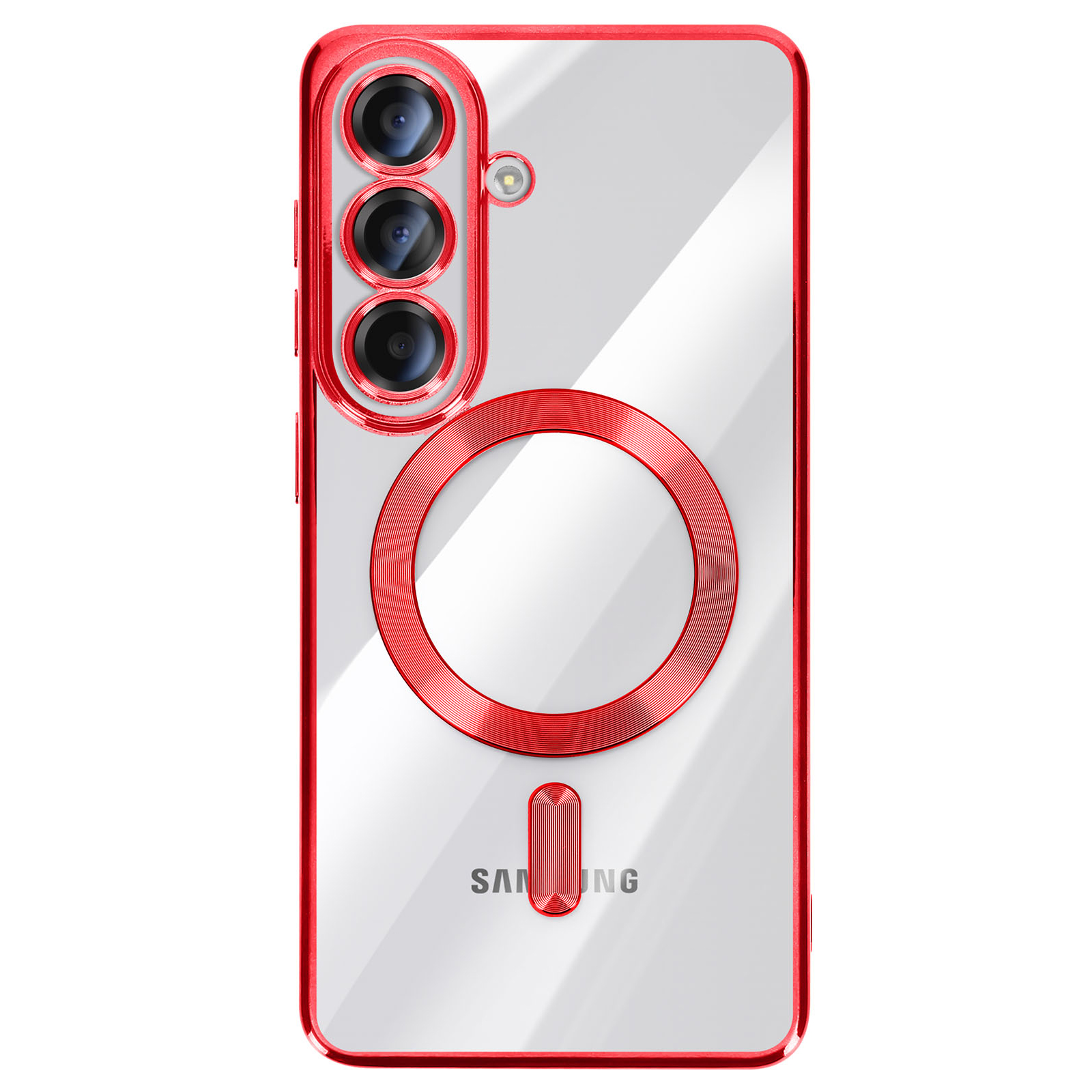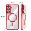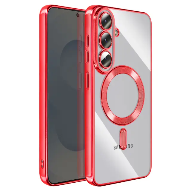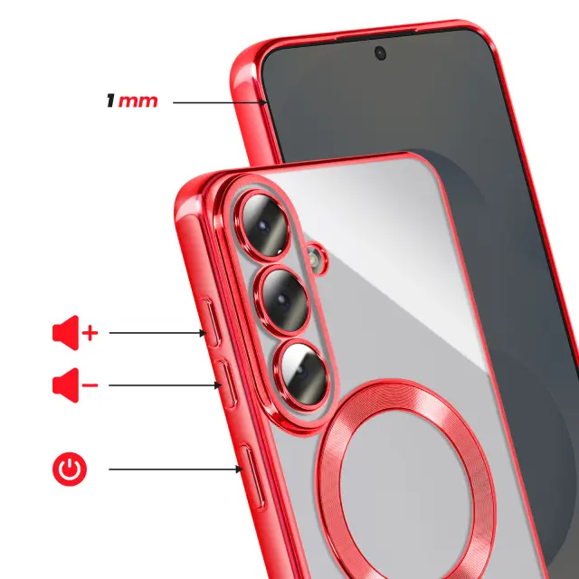 To ohišje za Samsung Galaxy S26 ima prozorno silikonsko hrbtno stran s kromirano obrobo.. Prilagodljiv material absorbira lahke udarce in omogoča enostavno namestitev in odstranitev školjke.. Vgrajen magnetni obroč omogoča združljivost etuija z dodatki MagSafe in brezžičnim polnjenjem. Dvignjeni obročki okoli leč omejujejo neposreden stik med fotografskim modulom in ravnimi površinami..