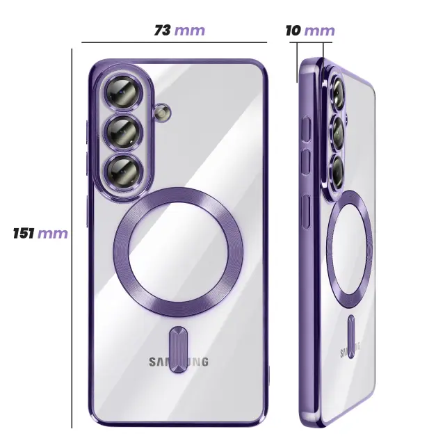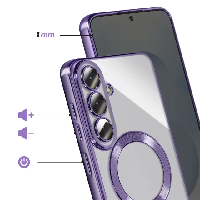 To ohišje za Samsung Galaxy S26 ima prozorno silikonsko hrbtno stran s kromirano obrobo.. Prilagodljiv material absorbira lahke udarce in omogoča enostavno namestitev in odstranitev školjke.. Vgrajen magnetni obroč omogoča združljivost etuija z dodatki MagSafe in brezžičnim polnjenjem. Dvignjeni obročki okoli leč omejujejo neposreden stik med fotografskim modulom in ravnimi površinami..