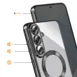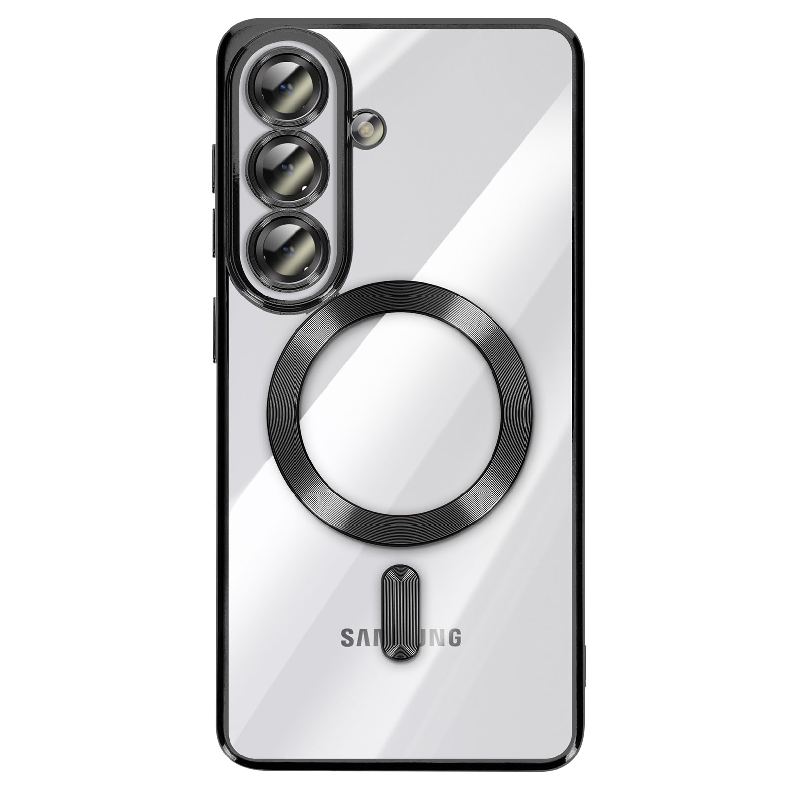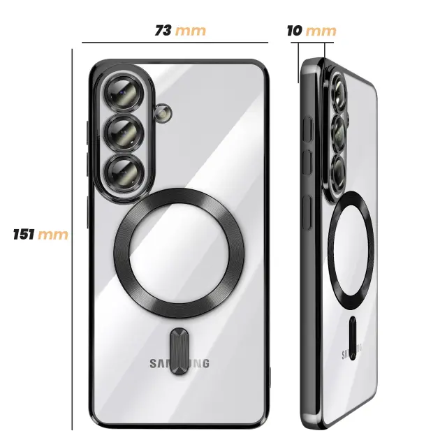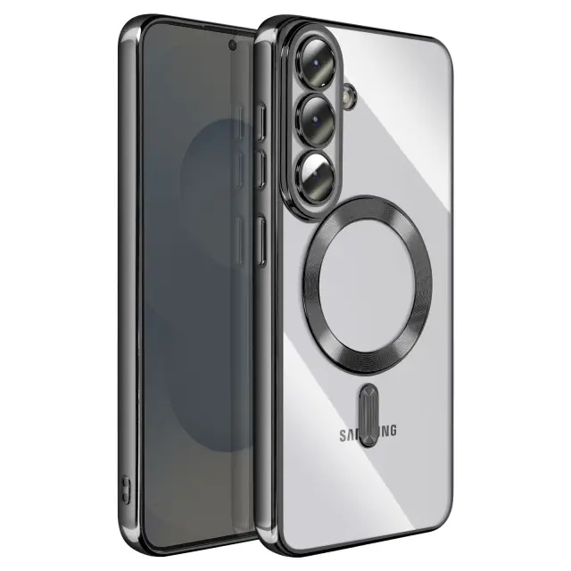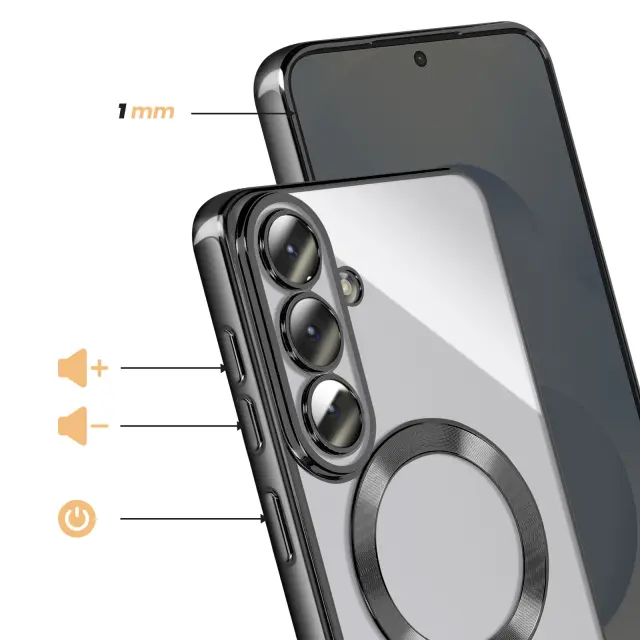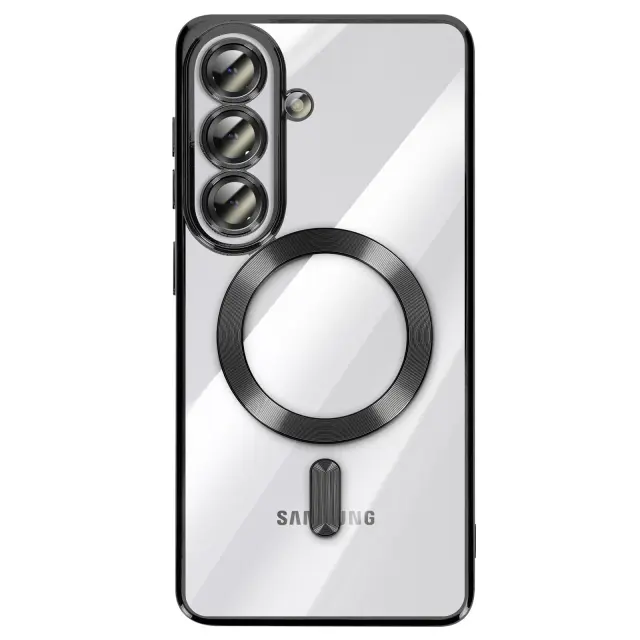 To ohišje za Samsung Galaxy S26 ima prozorno silikonsko hrbtno stran s kromirano obrobo.. Prilagodljiv material absorbira lahke udarce in omogoča enostavno namestitev in odstranitev školjke.. Vgrajen magnetni obroč omogoča združljivost etuija z dodatki MagSafe in brezžičnim polnjenjem. Dvignjeni obročki okoli leč omejujejo neposreden stik med fotografskim modulom in ravnimi površinami..