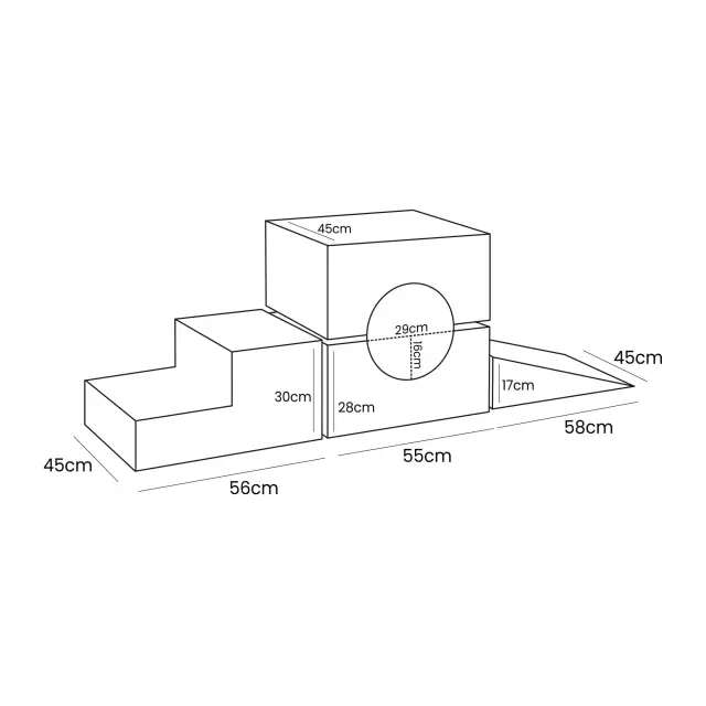 Posamezni elementi lahko delujejo kot torbica ali sedež. Antialergijsko poliuretansko peno, ki je uporabljena za izdelavo kompleta, odlikuje majhna teža in visoka odpornost na deformacije, zaradi česar je izdelek varen za otroke in hkrati izjemno praktičen. Posamezni bloki so lahki, zato jih je mogoče enostavno prestaviti na druga mesta. Vsi elementi kompleta imajo odstranljivo prevleko, ki omogoča enostavno pranje v pralnem stroju in ohranja čistočo oviratlona. Penasta garnitura je popoln element opreme za otroške sobe, otroške sobe in igralnice, predvsem zaradi izjemno prijetne prevleke na dotik. Preprost in minimalističen dizajn tega izdelka se popolnoma prilega bivalnemu prostoru.
