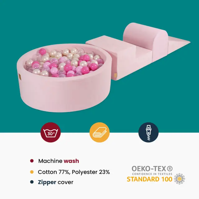 MeowBaby® Penasti igralni set z jamo za žogo 90x30cm/200 žogic 7cm, Igralni set za otroka, 4 elementi, Velvet žamet, Pesek, Žoge: prozorne