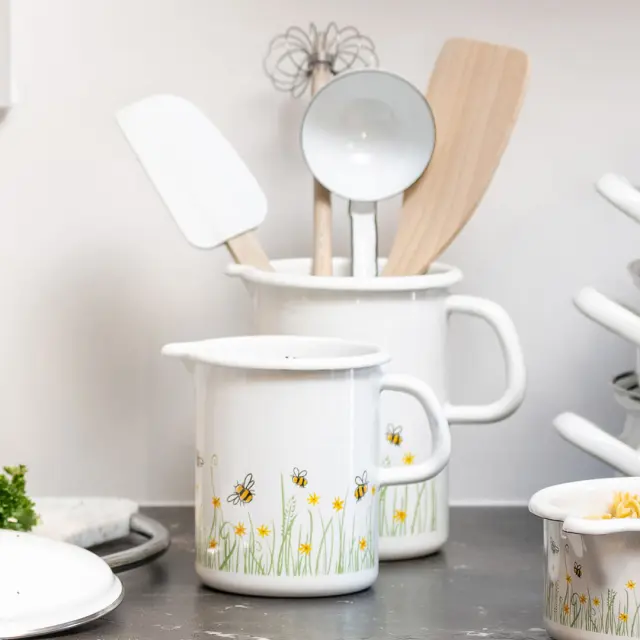 Kuhinjska merica za merjenje ali merilni lonček Bee se uporablja za pripravo sestavin za kuhanje in peko, kot so moka, sladkor, mleko, voda in druge hladne ali vroče tekočine. Dvojna lestvica na notranji strani prikazuje prostornino do 1 litra. Merilni lonček ima udoben stranski ročaj kot tudi izliv, imenovan kljun, ki služi za enostavno nalivanje tekočine. Z zaobljenim robom in simpatičnim dizajnom čebelic, je primeren tudi za postrežbo neposredno na mizo. Izdelan je iz emajla. To je železo, ki je pri visokih temperaturah stopljeno s steklom. Emajlirana posoda je priporočljiva tudi za ljudi z alergijami na nikelj. Lonec lahko uporabite na vseh vrstah štedilnikov (plinskih, električnih, steklokeramičnih, indukcijskih in tudi na odprtem ognju). Zaradi železnega jedra emajl hitro prevaja toploto in jo trajnostno shrani za energetsko varčno kuhanje. Popolno higieno zagotavlja gladka steklena površina brez por. Le-ta ne vpliva na okus, zavira razmnoževanje mikroorganizmov in je poleg tega enostavna za čiščenje. Ob pravilni uporabi in ustrezni negi bo posoda iz emajla zdržala dolgo časa in ohranila svoj tipičen sijaj. Lonček je primeren za pomivanje v pomivalnem stroju. NAMIG: Preverite še ostalo ponudbo posode iz linije Biene. NASVET: Merilni lonček iz emajla se lahko uporablja za segrevanje točno odmerjenih tekočin, kot je mleko (ali voda) za kvašeno testo ali juho za rižoto. Vendar pa je treba kuhati na majhnem ognju, saj je premer dna zelo majhen. Pri segrevanju mleka predhodno dodamo malo vode, da se ne prismodi.