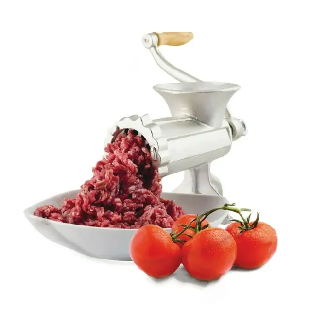 STROJČEK ZA MLETJE MESA Z NASTAVKI ZA BRIZGANO PECIVO EVA (ROČNA MESOREZNICA, KEKSOREZNICA) je izdelan iz litega železa – ghize s standardno perforirano ploščo z odprtinami s premerom 4,5 mm in rezilom iz nerjavečega jekla. Primeren je za mletje mesa, sadja ali pripravo keksov. Na površino ga enostavno pritrdite s primežem, trdna kovinska ročica z lesenim ročajem pa bo poskrbela za enostavno in udobno vrtenje.