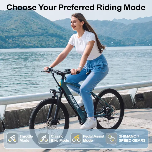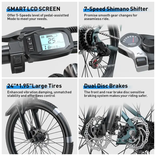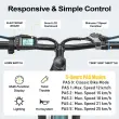 Dvojne kolutne zavore spredaj in zadaj (160 mm) zagotavljajo zanesljivo zavorno moč, lahek okvir iz ogljikovega jekla pa podpira do 150 kg. Nastavljiva višina sedeža (84–96 cm) omogoča udobno vožnjo za voznike, visoke od 152 do 180 cm.